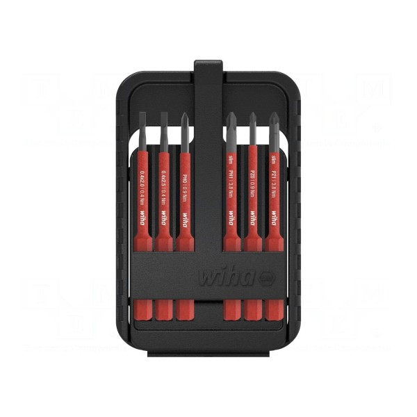 Końcówki posiadają sześciokątny rodzaj uchwytu i obsługują maksymalny moment obrotowy do 5,5 Nm. Dostępne rozmiary grota w zestawie to: SL 2, SL 2,5, SL 3,5, SL 4, SL 5,5 oraz SL 6. Elementy te są kompatybilne z uchwytami typu slimTorque oraz slimVario marki Wiha.