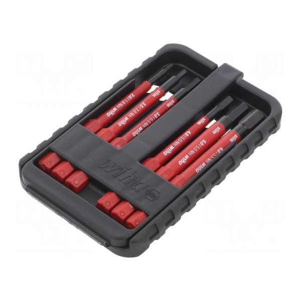 W skład kompletu wchodzą rozmiary HEX 2mm, 2,5mm, 3mm, 4mm, 5mm oraz 6mm. Narzędzia dopuszczają maksymalny moment obrotowy 5,5Nm i są w pełni zgodne z normą EN 60900 dotyczącą pracy pod napięciem. Komponenty te znajdują zastosowanie w pracy z uchwytami slimTorque oraz slimVario marki Wiha.
