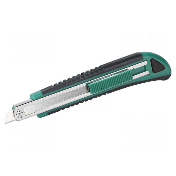 Nóż uniwersalny o szerokości ostrza 9 mm jest przeznaczony do różnorodnych prac warsztatowych i technicznych. Narzędzie wyposażone jest w system blokady ostrza oraz mechanizm umożliwiający wysuwanie i łamanie segmentów ostrza w celu zachowania jego ostrości.