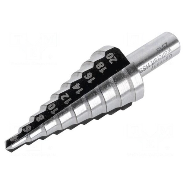 Wiertło stopniowe stożkowe wykonane ze stali szybkotnącej HSS umożliwia wykonywanie otworów o średnicach od 4 do 20 mm. Narzędzie wyposażono w 9 stopni oraz 3 krawędzie tnące, co usprawnia proces wiercenia. Długość części roboczej wiertła wynosi 44 mm, a średnica uchwytu została określona na 8 mm.