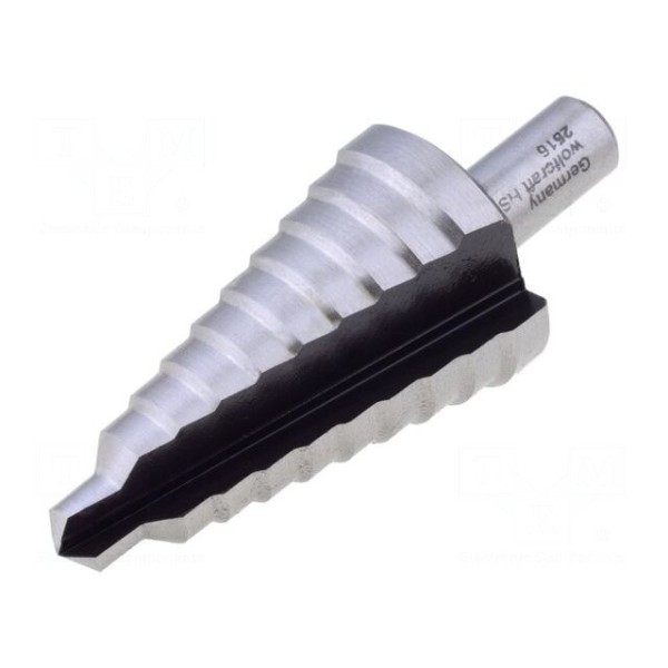 Wiertło stopniowe wykonane ze stali szybkotnącej HSS przeznaczone jest do obróbki otworów o średnicach od 8 do 30 mm. Narzędzie wyposażone jest w 10 stopni wiercenia oraz 3 krawędzie tnące, co umożliwia wykonywanie precyzyjnych otworów w jednym cyklu pracy. Długość części roboczej wynosi 54 mm.