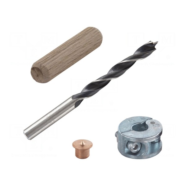 W zestawie: 4x znaczniki Ø10mm, kołek drewniany długi Ø10mm x19, ogranicznik głębokości Ø10mm, wiertło do połączeń kołkowych Ø10mm.