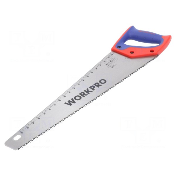 Piła ręczna Workpro W016034 przeznaczona jest do prac cięcia w drewnie oraz tworzywach sztucznych. Narzędzie wyposażone jest w brzeszczot o długości części roboczej wynoszącej 500 mm.