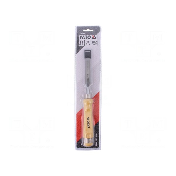 Dłuto przeznaczone do obróbki drewna wyposażone jest w ostrze o szerokości 14 mm. Narzędzie wykonano ze stali chromowo-wanadowej, której twardość ostrza wynosi 58-60 HRC.