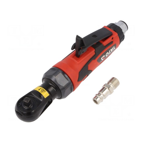 Grzechotka pneumatyczna YATO YT-09795 wyposażona jest w zabierak typu kwadrat o rozmiarze 1/4". Urządzenie zasilane jest sprężonym powietrzem, co umożliwia pracę w warunkach warsztatowych przy montażu i demontażu połączeń gwintowych.