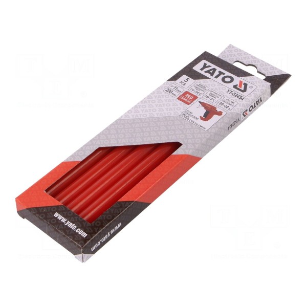 Klej termotopliwy YATO to sztyfty o średnicy 11,2 mm oraz długości 200 mm, przeznaczone do pracy w pistoletach klejowych. Czerwone wkłady charakteryzują się temperaturą mięknięcia wynoszącą 85°C oraz optymalnym zakresem temperatury pracy od 170°C do 200°C.