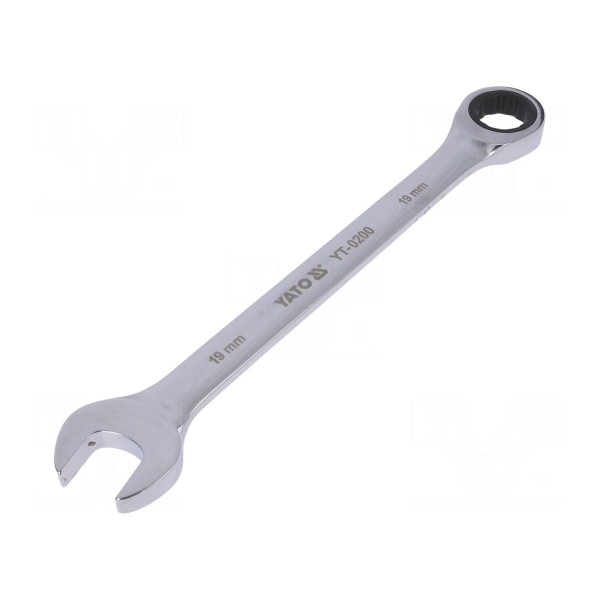Klucz płasko-oczkowy został wyposażony w zintegrowany mechanizm grzechotki, co umożliwia szybką pracę w ograniczonych przestrzeniach. Narzędzie posiada rozmiar roboczy wynoszący 19mm.