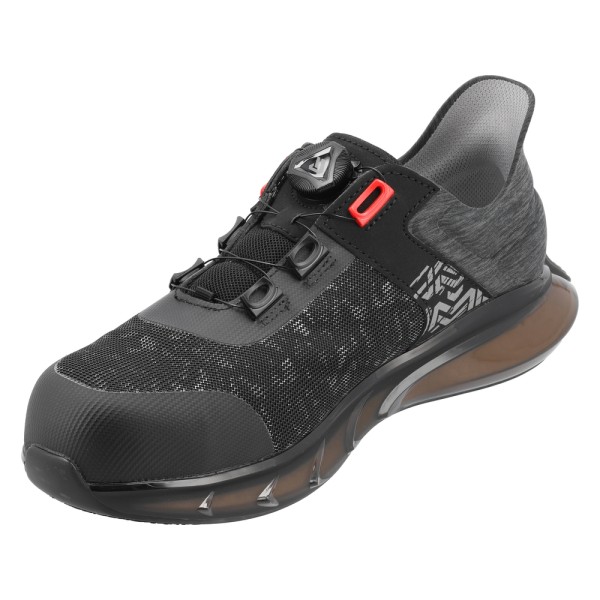 Trójmateriałowa podeszwa posiada zewnętrzną część z TPU pełniącą funkcję poduszki powietrznej oraz wewnętrzną warstwę z responsywnego ETPU. Antypoślizgowy bieżnik z gumy zapewnia stabilność na powierzchniach z detergentem i substancjami oleistymi. Cholewka wykonana z tkaniny poliestrowej z warstwą TPU, zintegrowanym zapiętkiem z pianki PU i TPU oraz zapięciem typu sznurowadła półautomatyczne na pokrętło.