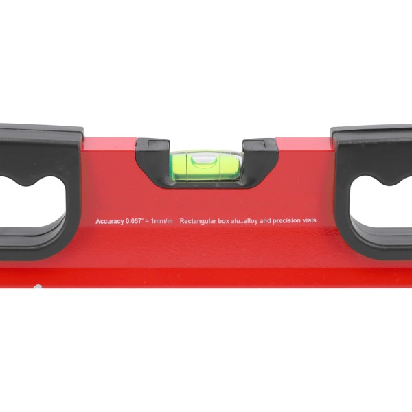 Profil aluminiowy o grubości 1,5 mm z trzema libellami (pion, poziom, 45°).
