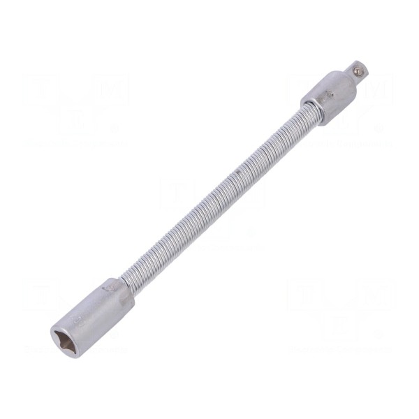 Całkowita długość przedłużki wynosi 0,15m. Elastyczne wykonanie pozwala na przeniesienie momentu obrotowego pod kątem względem osi narzędzia napędowego.