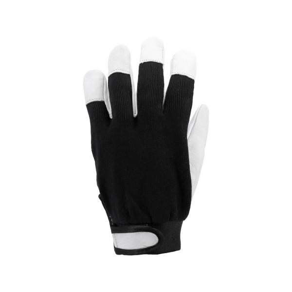Rękawice wykonane z miękkiej skóry naturalnej oraz dzianiny bawełnianej w kolorze czarnym. Przeznaczone do pracy w ogrodzie oraz do wykonywania prac niewymagających wysokiej precyzji chwytu.