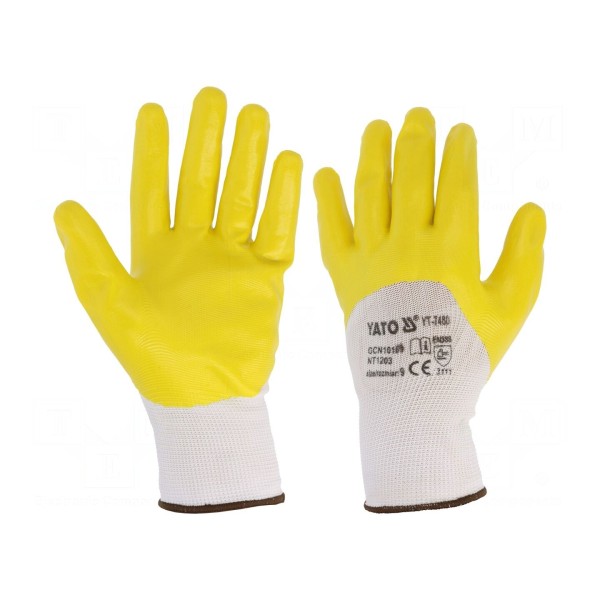 Rękawice ochronne YATO w rozmiarze 9 charakteryzują się konstrukcją, która nie chłonie olejów oraz smarów. Produkt o żółtej barwie został zaklasyfikowany do drugiej kategorii ochrony.