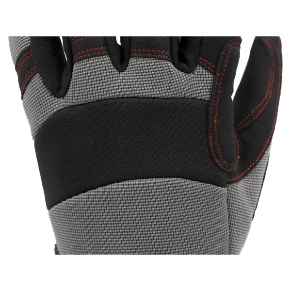Skóra syntetyczna w części chwytnej zapewnia dopasowanie do dłoni. Neopren na kostkach dostosowuje się do zgięć dłoni, a dwuwarstwowa tkanina wierzchnia z nylonu z dodatkiem spandexu chroni przed zagrożeniami mechanicznymi.