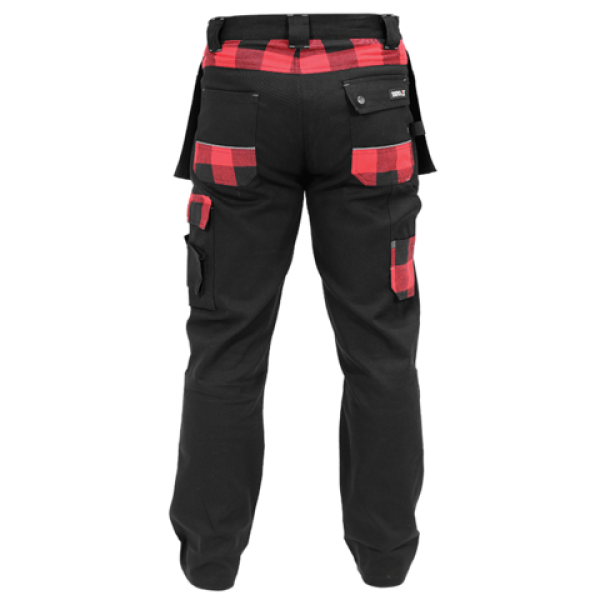 Bawełna zapewnia oddychalność materiału oraz ochronę przed iskrami. Elastan zwiększa rozciągliwość i dopasowanie odzieży do sylwetki. Czerwono-czarny materiał typu flanela na kieszeniach oraz pod pasem poprawia właściwości termiczne.