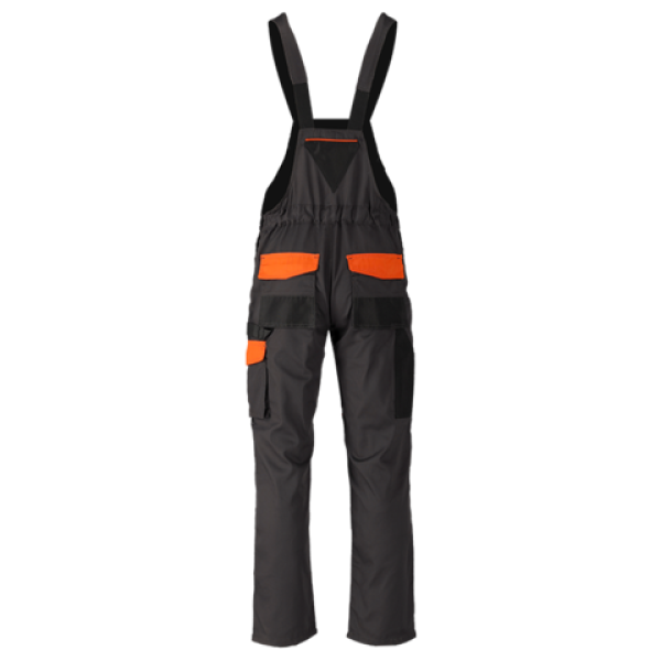 Spodnie robocze na szelkach typu ogrodniczki z trzynastoma kieszeniami, w tym siedem z zapięciem na rzep oraz kieszenie na nakolanniki.