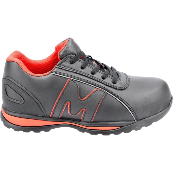 Lekki model z kompozytowym podnoskiem, elastyczną wkładką antyprzebiciową oraz zewnętrznym wzmocnieniem pięty ułatwiającym zdejmowanie obuwia. Cholewkę wykonano ze skóry licowej i ozdobiono odblaskowymi liniami.