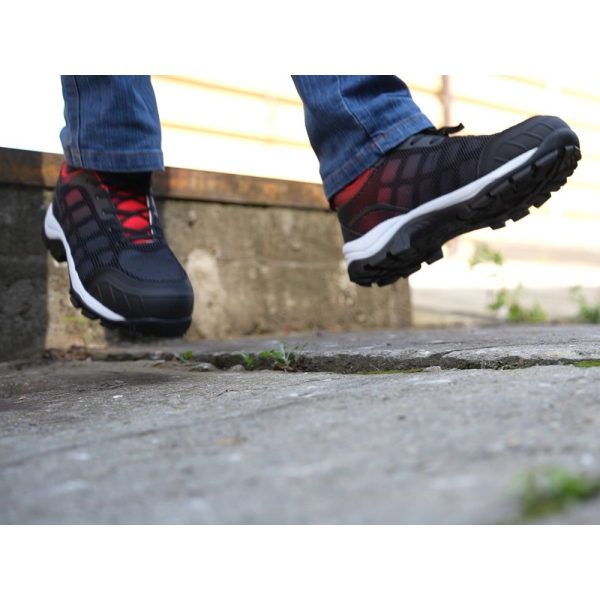 Półbuty nie zawierają metalu. Wkładka antyprzebiciowa oraz podeszwa nie ograniczają zgięć śródstopia. Struktura siateczki w połączeniu z materiałem wyściółki zapewnia przewiewność.