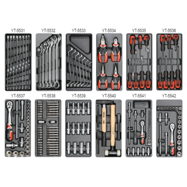- Szuflada 1: klucze płasko-oczkowe: 6, 7, 8, 9, 10, 11, 12, 13, 14, 15, 16, 17, 18, 19, 20, 21, 22, 24, 27, 28, 30, 32 mm; klucze oczkowe odgięte: 6x7, 8x9, 10x11, 12x13, 14x15, 16x17, 18x19 mm