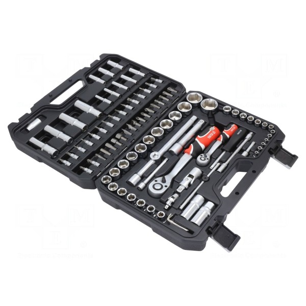 W zestawie: adapter 1/4", grzechotka 1/2", końcówki wkrętakowe, nasadki 6-kątne, przedłużacz 1/2" o długości 125mm, przedłużacz 1/2" o długości 250mm, przedłużacz 1/4" o długości 50mm, przedłużacz 1/4" o długości 100mm.