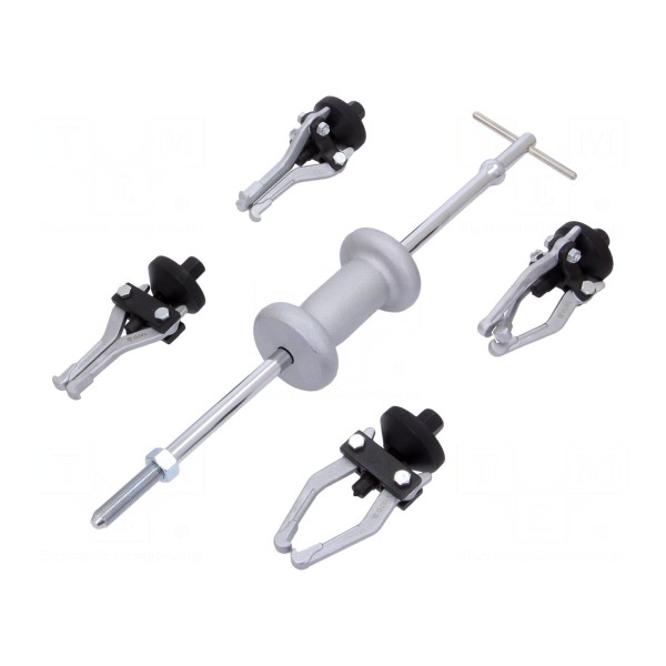 Zestaw narzędzi obejmuje ściągacz do łożysk, który umożliwia pracę w konfiguracji dwuramiennej oraz trójramiennej. Pakiet zawiera łącznie 5 elementów niezbędnych do demontażu elementów osadzonych na wałach.