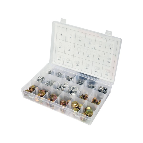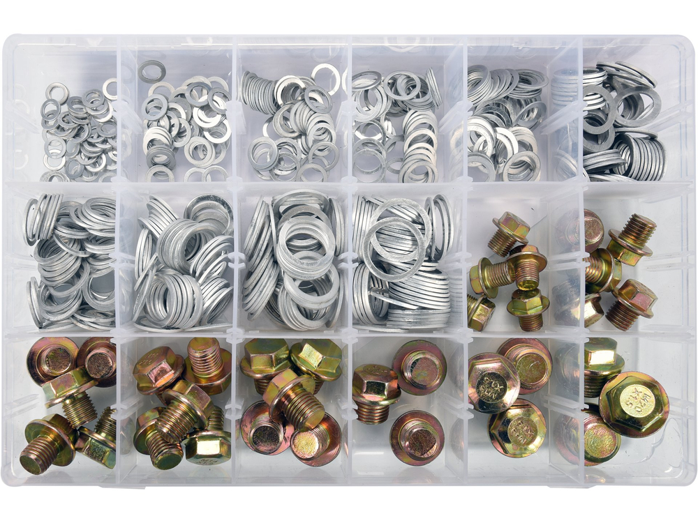 Zawiera 500 podkładek w 10 rozmiarach oraz 34 korki spustowe z różnymi gwintami.